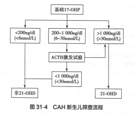 如果筛查发现17-0HP升高在6-30nmolL,需要进行促肾上腺皮质激素(ACTH)激发试验或进行相关基因检测明确诊断。激发试验结果判定见图。但由于17-羟孕酮易受多种因素(如体质、胎龄、应激、感染、情绪、疾病,服药时间、检测方法等)影响而波动,研究发现即使基因型相同,17-羟孕酮浓度差异也很大,故不能单纯用17-羟孕酮浓度进行分型。